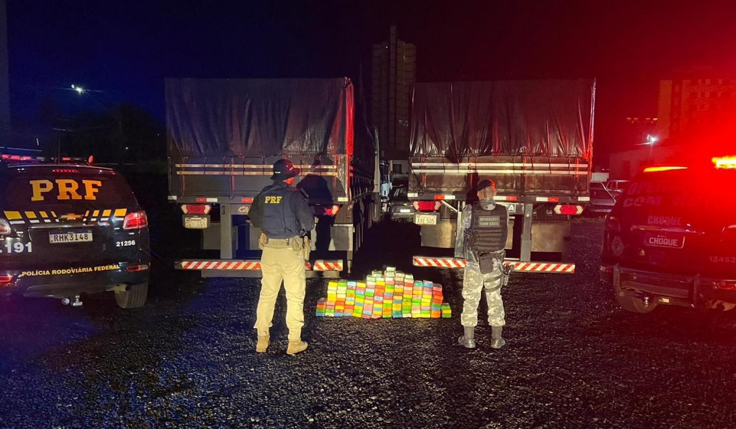 Na noite desta terça-feira (28), por volta das 19 horas, policiais rodoviários federais, abordaram, no km 319 da BR 277, em Guarapuava, no centro Sul do Estado, duas carretas, com placas paraguaias.