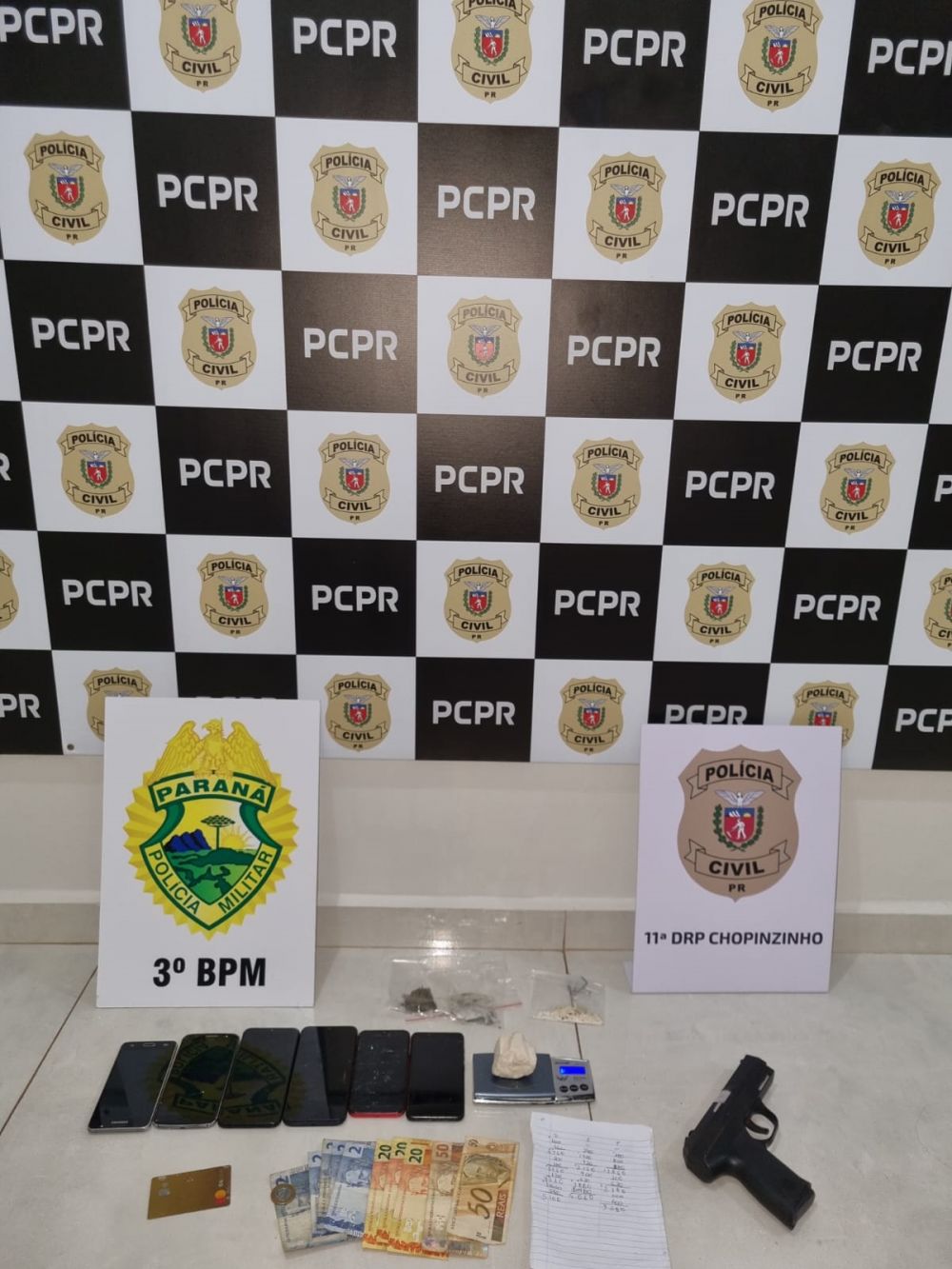 De posse da ordem legal, no início da manhã desta terça-feira (07.03.2023), a Polícia Civil de CHOPINZINHO, com apoio da Polícia Militar, se deslocaram ao referido endereço no Bairro Nossa Senhora Aparecida, onde deram fiel cumprimento ao mandado de busca e apreensão domiciliar na residência dos investigados, tendo sido apreendidas aproximadamente 70 gramas de pasta base de cocaína, 7 gramas de substância análoga à cocaína, 10 gramas de substância análoga à maconha, balança de precisão, caderno de anotações, um simulacro de arma de fogo, (06) seis aparelhos celulares e R$ 171,00 (cento e setenta e um reais) em espécie, sendo dada voz de prisão aos investigados pelos delitos de tráfico de drogas e associação para o tráfico.
