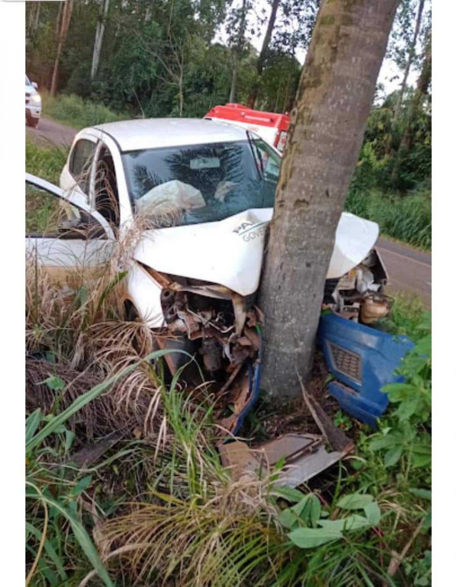 Neste momento o condutor do veículo da Secretaria de Saúde de Quedas do Iguaçu acabou perdendo o controle, saiu da pista e colidiu contra uma árvore.