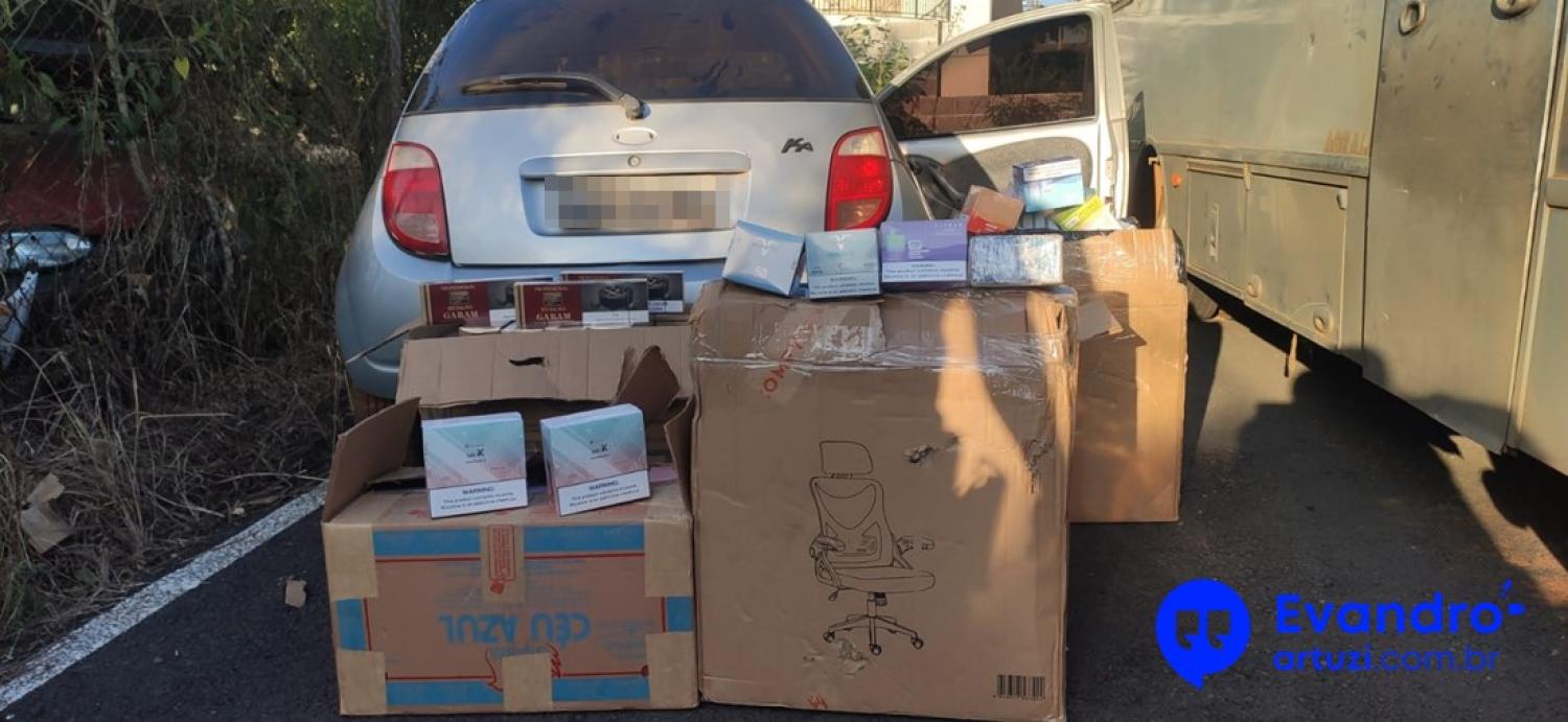 O veículo, um Ford Ka, foi encontrado abandonado no Km 395 da rodovia. No interior do carro foram encontradas 162 caixas de cigarros eletrônicos, 60 caixas de loção capilar e 98 pacotes de cigarros.