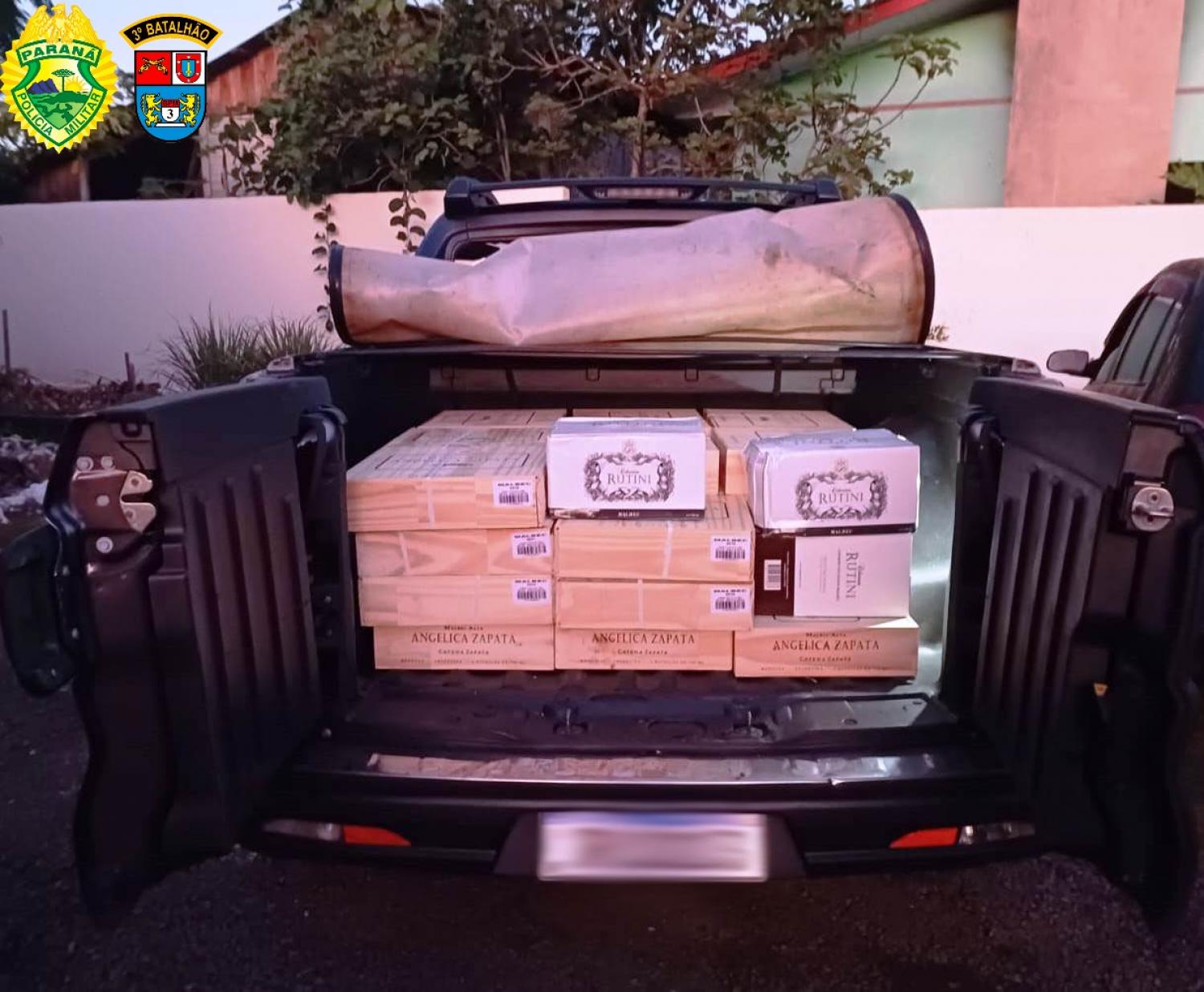 Nesta quinta-feira, dia 11, por volta das 5h20min, durante operação bloqueio na rodovia BR-158, próximo a Comunidade Urutu, Saudade do Iguaçu-PR, em continuidade às diligências após a ocorrência de roubo às agências bancárias de Sulina-PR no último dia 5 de maio, foi realizada abordagem ao veículo Fiat/Toro, de cor cinza, conduzido por um indivíduo (27), e após buscas no veículo foram localizadas na carroceria 272 garrafas de vinho oriundas da Argentina, sem o devido desembaraço aduaneiro.