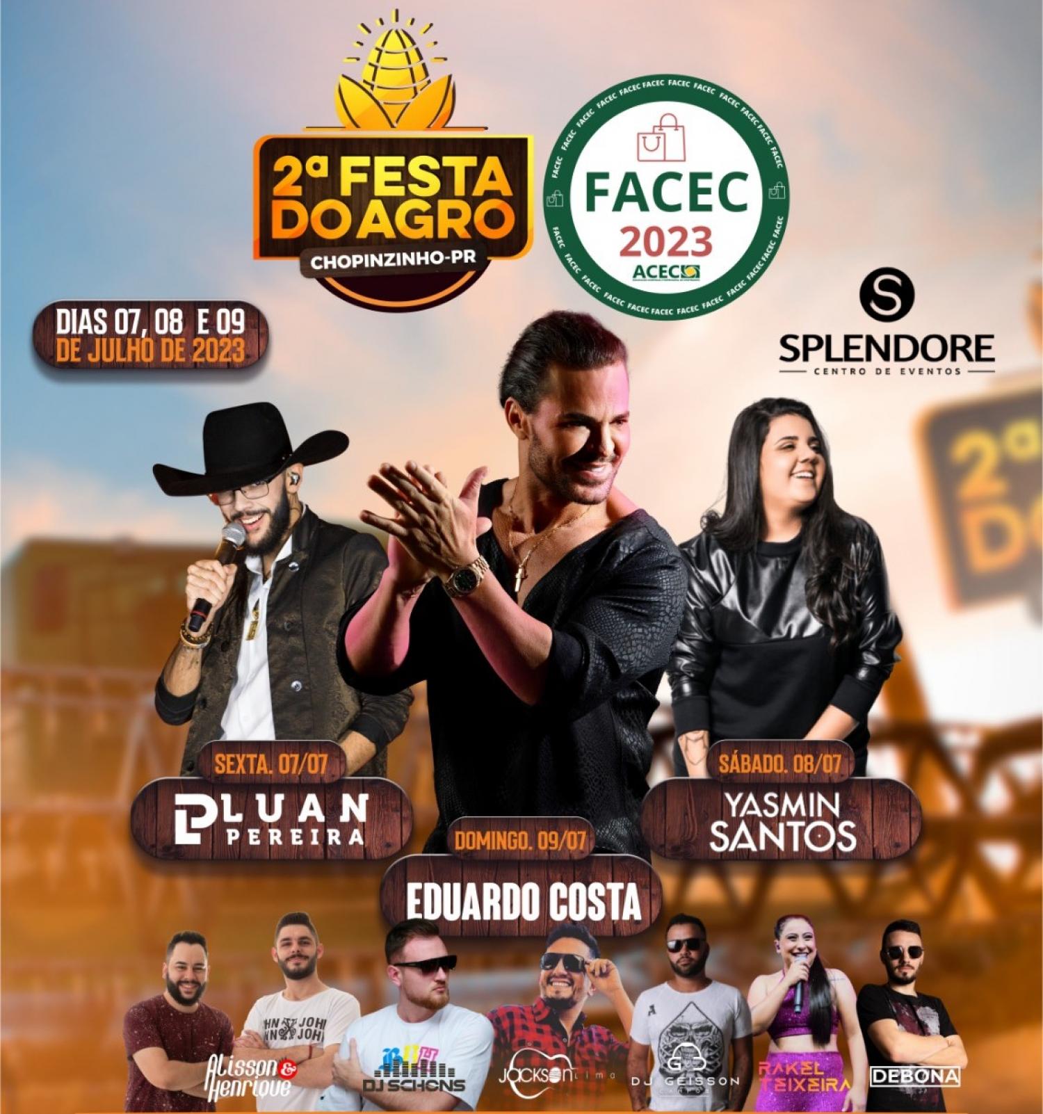 Foi lançada em Chopinzinho, no Sudoeste do Estado, na noite da última sexta-feira (12), a programação da Segunda Festa do Agro e a Facec 2023 – Feira Comercial e Agropecuária. O evento será realizado entre os dias 07 e 09 de julho. A unificação dos eventos é uma iniciativa da empresa Da Rosa promoções e da Acec – Associação Comercial e Empresarial de Chopinzinho, com objetivo de trair o público regional, oportunizando diversão e bons negócios.
