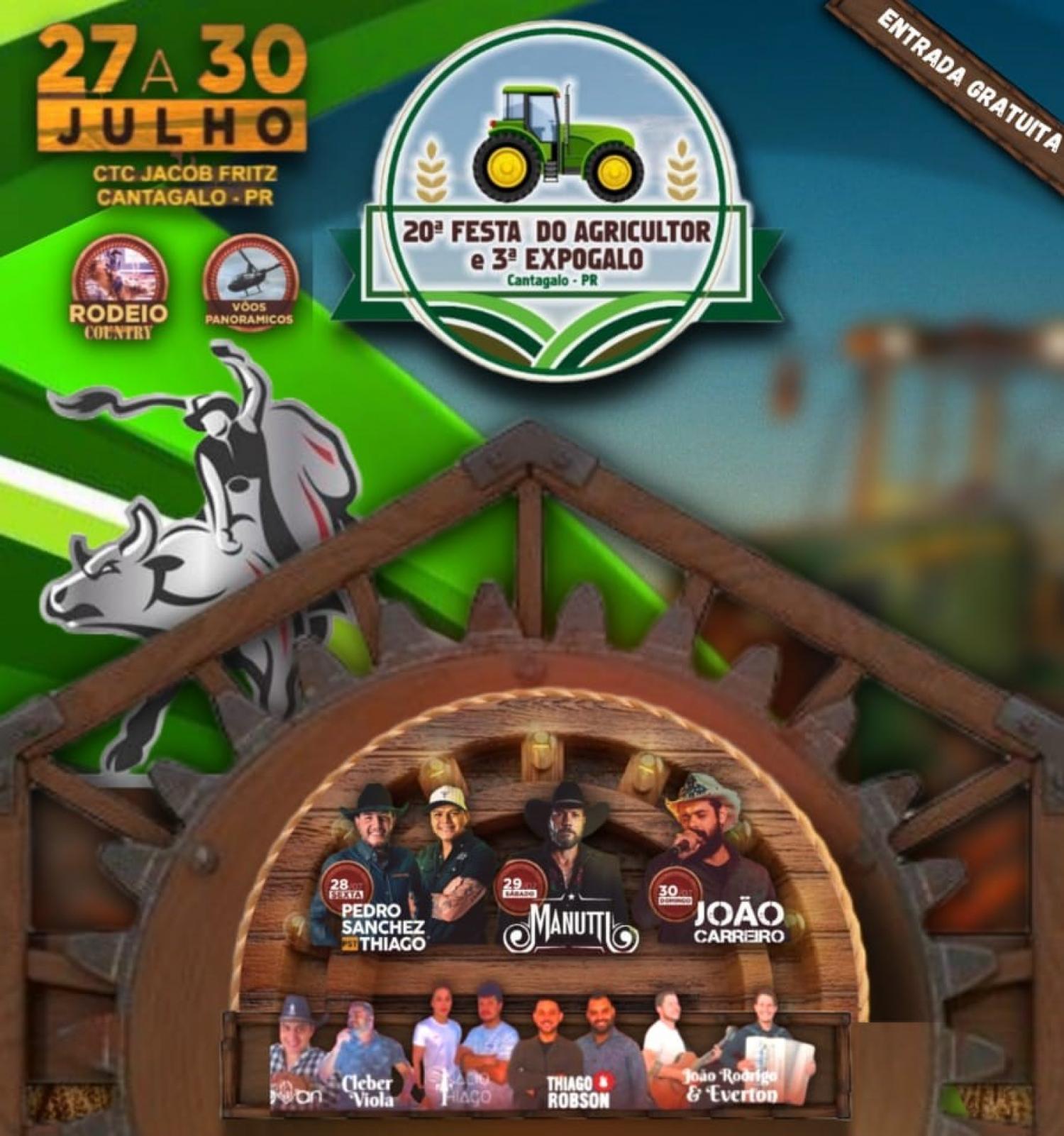 Shows, rodeio, voos panorâmicos, parque de diversões e exposição da indústria, comércio e agropecuária estão na programação da 20ª Festa do Agricultor e 3ª ExpoGalo nesse ano de 2023. O evento será realizado entre os dias 27 e 30 de julho no CTG Jacob Fritz, em Cantagalo, na região central do Paraná.
