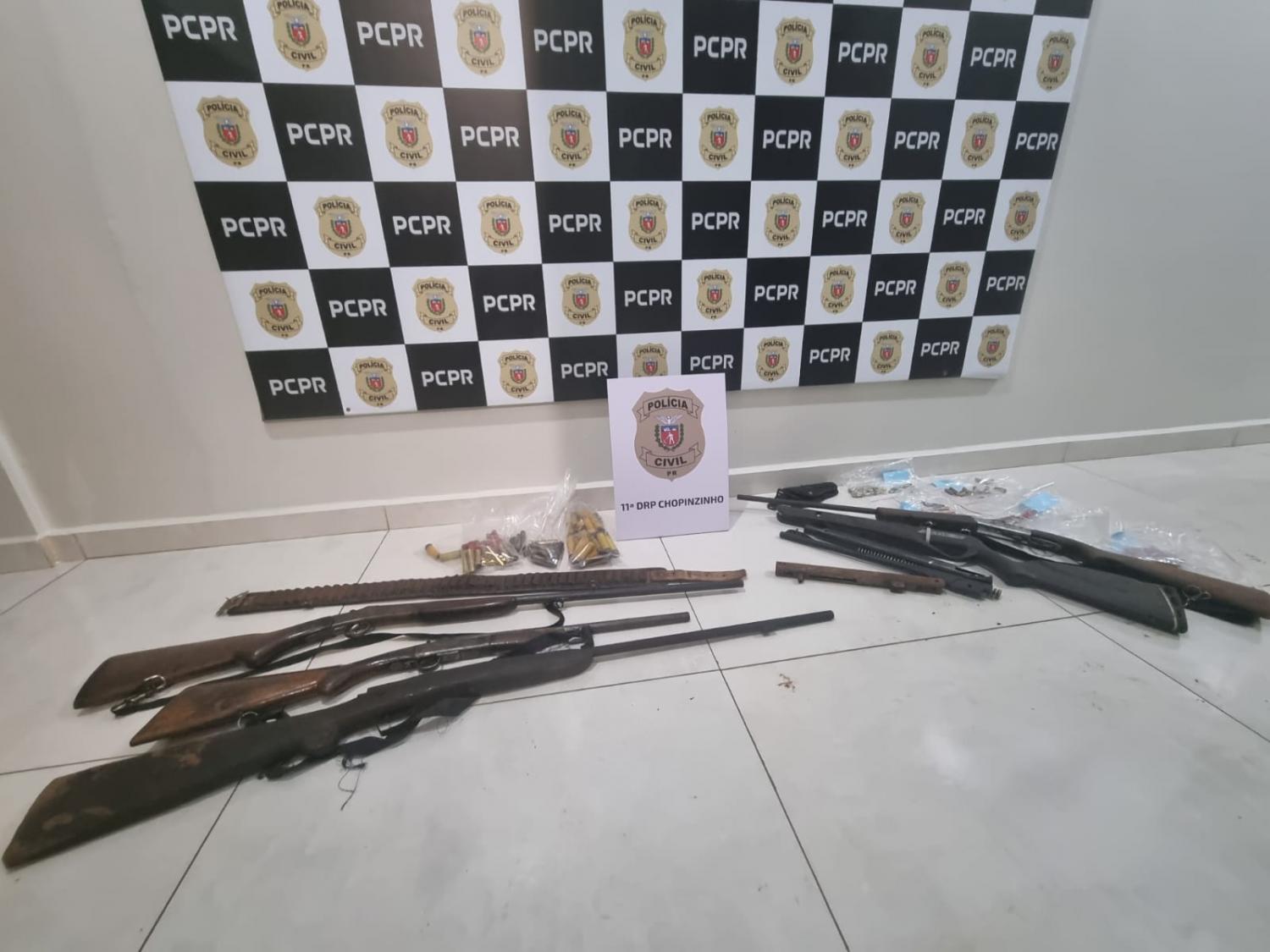 De posse da ordem legal, no início da manhã desta sexta-feira (16.06.2022), equipe da Polícia Civil de Chopinzinho, com apoio operacional de policiais civis da Delegacia de Mangueirinha, do DENARC de Pato Branco e da 5ª Subdivisão Policial de Pato Branco deram fiel cumprimento aos mandados de busca e apreensão domiciliar nas residências dos investigados, tendo sido apreendidas 04 (quatro) armas de fogo (tipo espingarda), sendo duas espingardas calibre 36 e duas espingardas calibre .32, além de insumos e cápsulas de munições calibre .38, .32 e .36 deflagradas e diversas munições calibre .22, 20, 32 e 36 intactas, sendo dada voz de prisão aos responsáveis.
