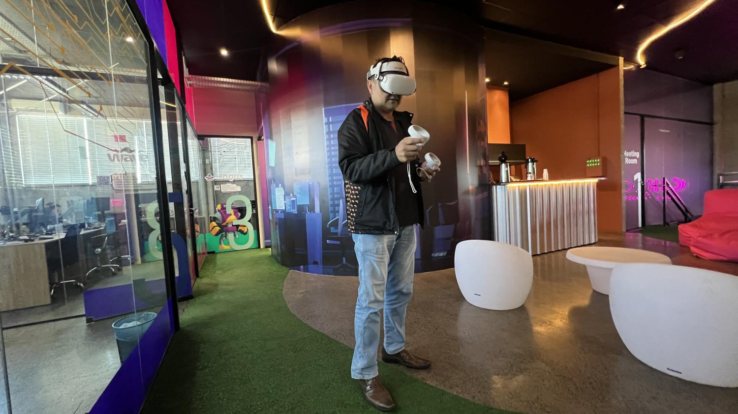 E uma das novidades deste ano é o óculos de realidade virtual Meta Quest, da empresa Meta, detentora das marcas Facebook, Instagram e WhatsApp. O óculos vai estar disponível no estande da empresa Rumo Nutrição Animal.