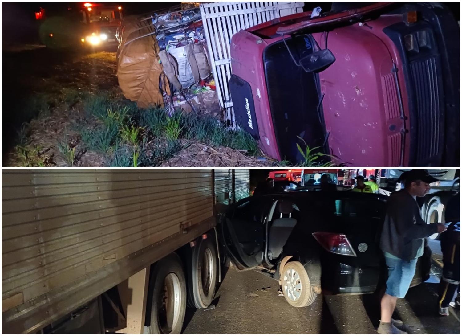 Um caminhão Mercedes Benz tombou na marginal da rodovia. Apesar dos danos, o motorista de 27 anos não sofreu ferimentos. O segundo atendimento foi prestado na BR-277, na antiga Praça de Pedágio de Candói. A ocorrência envolveu cinco veículos, três carros e dois caminhões.