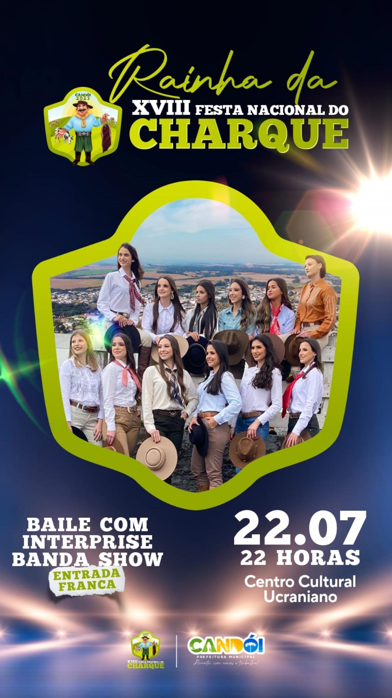 Depois do concurso, vai acontecer o Baile Popular de Lançamento da XVIII Festa Nacional do Charque, com animação da Banda Interprise. O concurso e o baile serão no Centro Cultural Ucraniano, em Candói, a partir das 22 horas deste sábado.