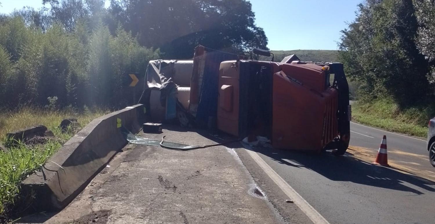 Um caminhão Scania, ocupado por duas pessoas, acabou tombando. Uma saiu ilesa e a outra foi atendida com lesões leves. O atendimento foi prestado pelas equipes da Brigada Comunitária e do Samu de Candói.