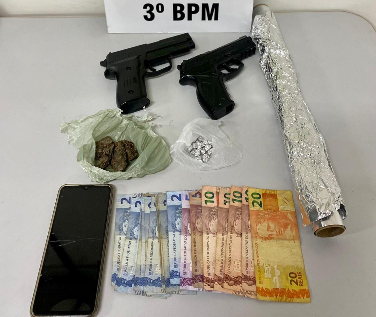 Com ele, a PM encontrou duas porções de crack, sendo informada que havia mais droga na residência. Com autorização foi realizada busca no local, sendo encontrado e apreendido 13 pedras de crack, maconha, um celulare, dinheiro, duas armas de brinquedo e embalagens para acondicionar drogas.