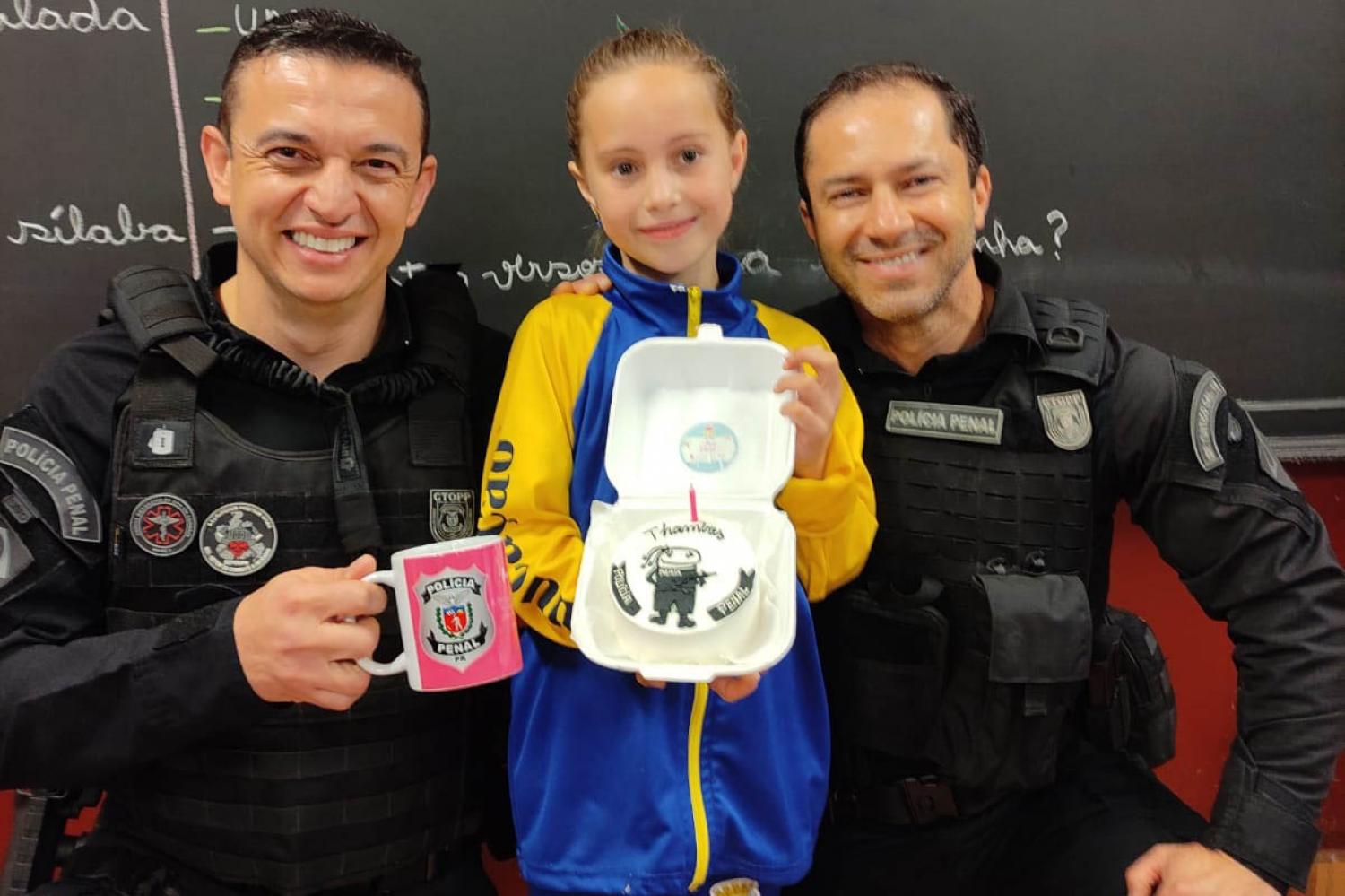 A pequena Thamyres Michely Pontarolo Linhares, moradora de Cantagalo, no Centro-Sul do Estado, teve uma sexta-feira (28) especial. Ela recebeu uma festa de aniversário surpresa de policiais penais pertencentes à regional de Guarapuava. Os servidores foram até a Escola Municipal Castro Alves, levaram presentes e prestaram uma homenagem à garotinha, que completou 8 anos. Thamyres é fã da Polícia Penal do Paraná (PPPR) e demonstrava ativamente à sua mãe, Marivania de Souza Pontarolo, o desejo de contar com a participação especial da instituição em seu aniversário.
