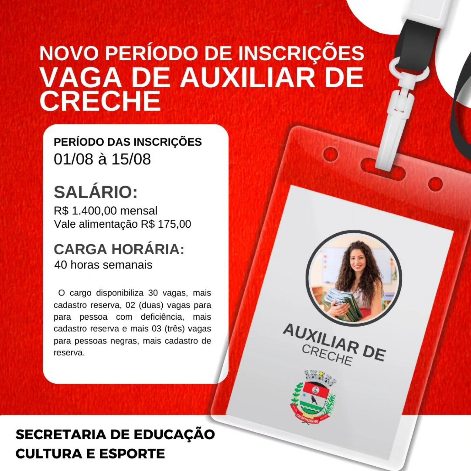 O Município de Chopinzinho abre inscrições para o Processo Seletivo para a vaga de Auxiliar de Creche, para o desenvolvimento de trabalhos junto à Secretaria de Educação, Cultura e Esporte.
