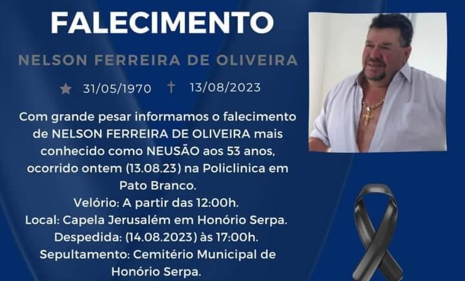 Morreu no hospital em Pato Branco neste domingo (13), Nelson Ferreira de Oliveira, conhecido popularmente como “Neusão”. Ele estava hospitalizado com ferimento provocado por disparo de arma de fogo.