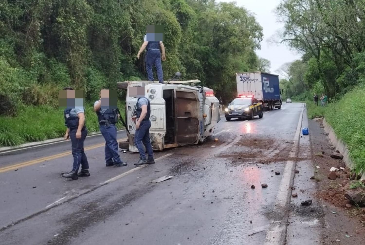 Um carro utilizado para transporte de valores (carro forte) se envolveu num acidente no fim da tarde desta sexta-feira (08) na BR-158, próximo da ponte do Rio Chopim. O veículo acabou capotando.