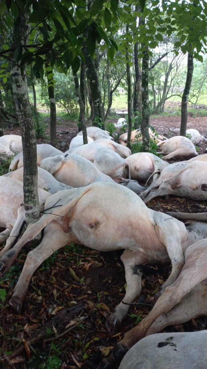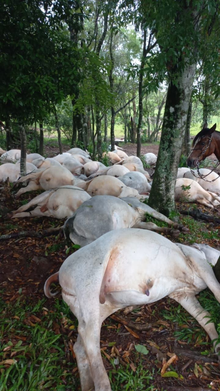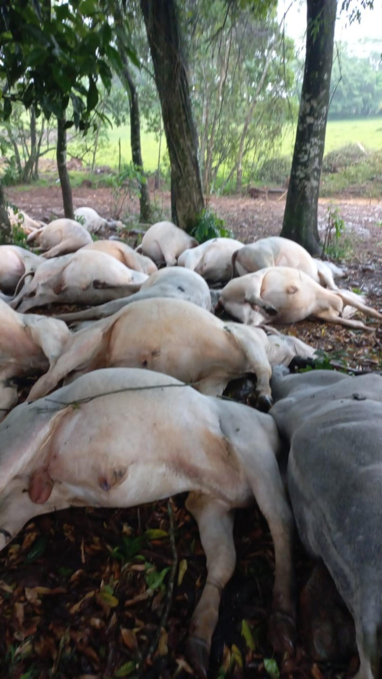 Segundo informações, 34 cabeças de gado morreram após um raio atingir os animais que estavam abrigados próximos a algumas árvores.