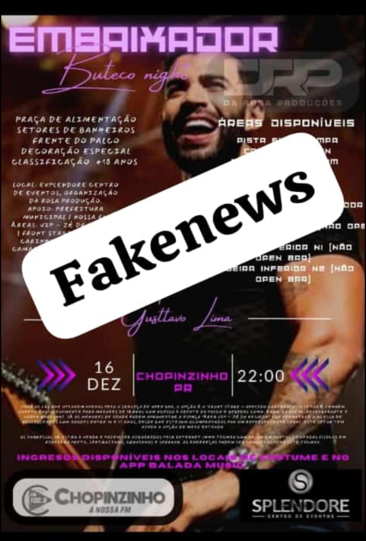 Um banner divulgado nas redes sociais anunciava show com o cantor sertanejo Gustavo Lima em Chopinzinho, no Splendore Centro de Eventos. Segundo a postagem, o show seria realizado no dia 16 de dezembro, a partir das 22 horas. O banner trazia informações sobre aquisição antecipada de ingressos por meio de um aplicativo, além do apoio da Nossa FM.
