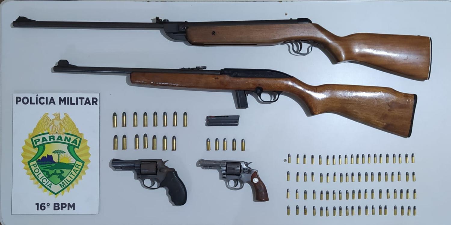 Quatro armas de fogo, duas espingardas e dois revólveres, além de uma quantidade expressiva de munição foram apreendidas pela Polícia Militar em Candói na noite desta segunda-feira (23). As apreensões foram realizadas numa residência, no Bairro Pioneiros. O dono das armas, um homem de 45 anos, foi denunciado pelo filho de 19 anos. Segundo o jovem, o pai estaria ameaçando de morte ele e sua mãe.