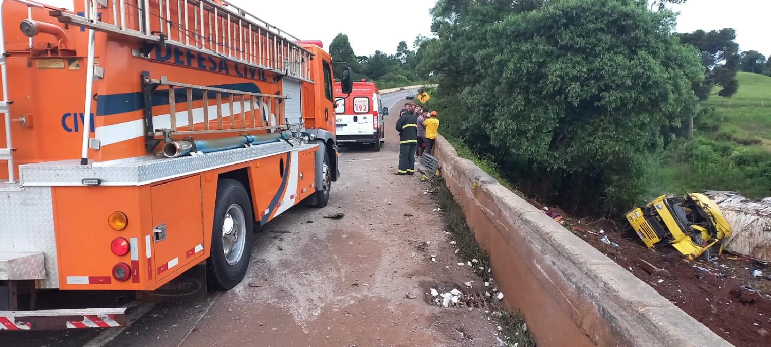 O caminhão, que seguia sentido Curitiba, saiu da pista e caiu numa ribanceira na marginal da BR-277. O passageiro, Rafael Pereira Modesto, de 31 anos, morador em Paranaguá, se feriu com gravidade. Ele foi socorrido pelo Samu ao hospital de Candói. Já o motorista, Ademir Rodrigues Caldeira, de 48 anos, morreu no local. O corpo dele foi recolhido ao IML de Guarapuava.