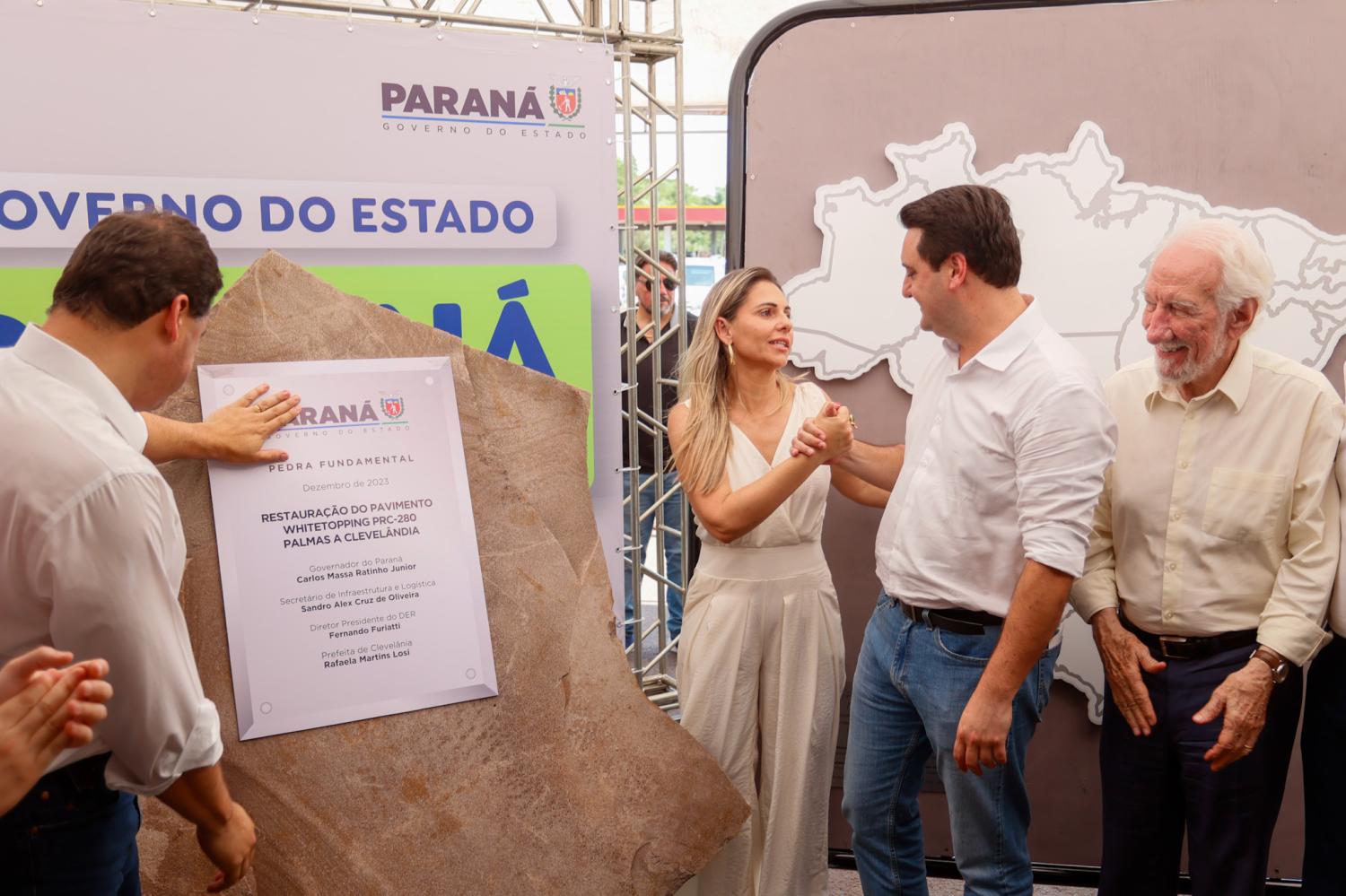 O governador Carlos Massa Ratinho Junior lançou nesta quinta-feira (14) a pedra fundamental da restauração da PRC-280 entre Palmas e Clevelândia, no Sudoeste do Paraná. A obra é orçada em R$ 188 milhões e consiste na instalação de um pavimento rígido de concreto nos 45 quilômetros da rodovia que separam os dois municípios, dentro de um projeto mais amplo de revitalização de um dos principais corredores logísticos da Estado.