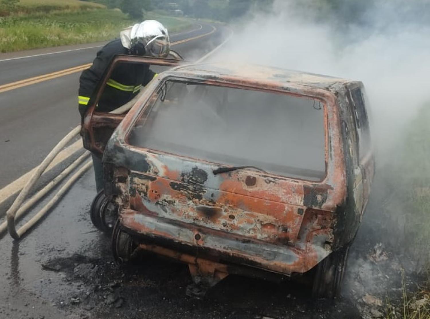 O sinistro foi em um veículo Fiat Uno emplacado em São Lourenço do Oeste (SC). O motorista tinha acabado de adquirir o carro e estava deslocando para casa, na comunidade de Cachoeira, quando ocorreu o incêndio.