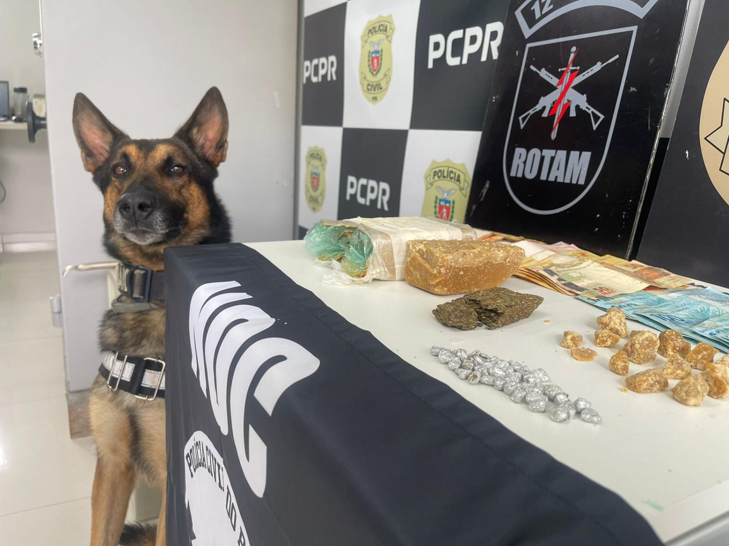 Durante as diligências, os cães do Núcleo de Operações com Cães da Polícia Civil localizou 854 gramas de crack e 43 gramas de maconha. Também foram apreendidos celulares, pen-drives e dinheiro em espécie.