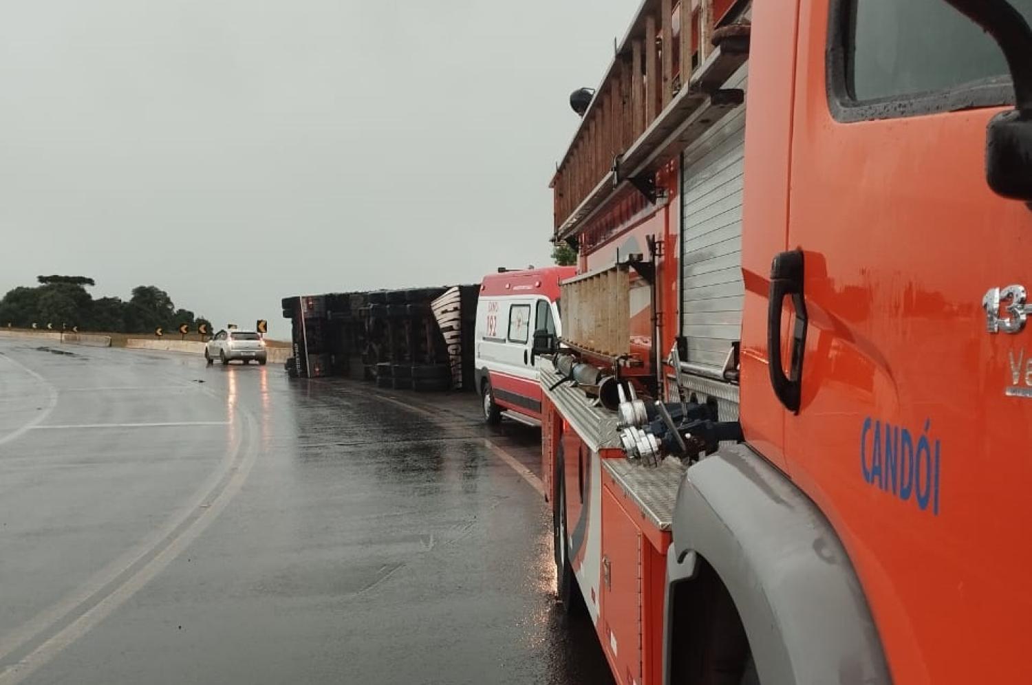 O caminhão tombou no viaduto que dá acesso da BR-277 a 373. Brigada Comunitária e Samu de Candói compareceram ao local e prestaram atendimento ao motorista. Ele sofreu ferimentos leves e foi encaminhado ao hospital de Candói.