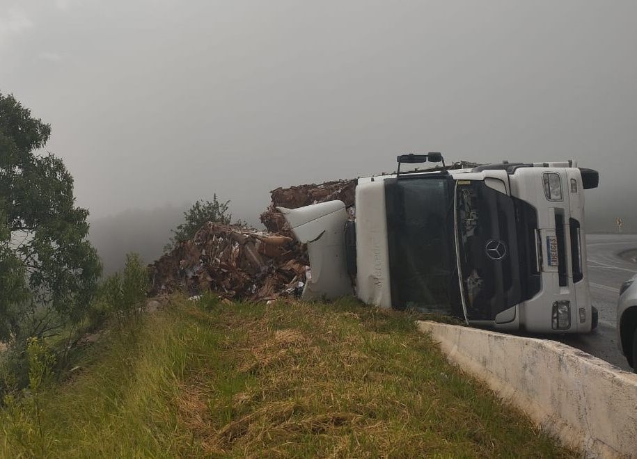 A Polícia Rodoviária Federal (PRF) foi acionada para o registro da ocorrência e acompanhou a retirada do caminhão, que transportava uma carga de papelão. As causas do acidente não foram informadas.