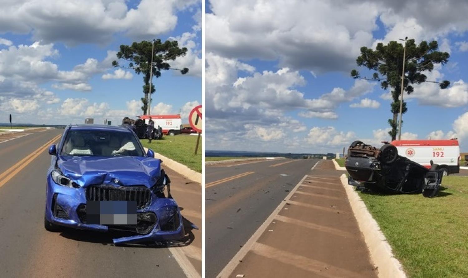 Uma BMW emplacada em Cascavel se envolveu no acidente com um Polo com placas de Toledo. Com o impacto da batida, o Polo capotou e parou em cima do canteiro de acesso ao restaurante.
