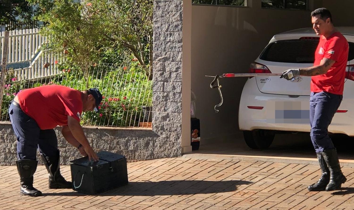 A serpente, da espécie jararaca, estava na garagem de uma residência, que fica nas proximidades do Estádio Municipal, na saída para Coronel Vivida.