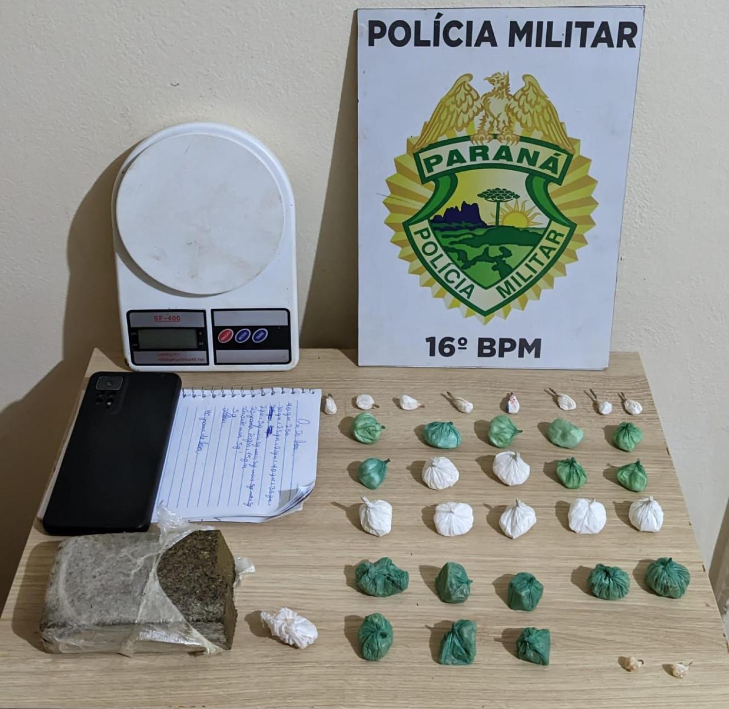 Um rapaz de 24 anos foi preso em Candói na noite desta segunda-feira (08) pelo crime de tráfico de drogas. Ele foi flagrado, após denúncias, com um tablete de maconha, porções de cocaína, crack, uma balança de precisão e um caderno com anotações referentes ao tráfico.