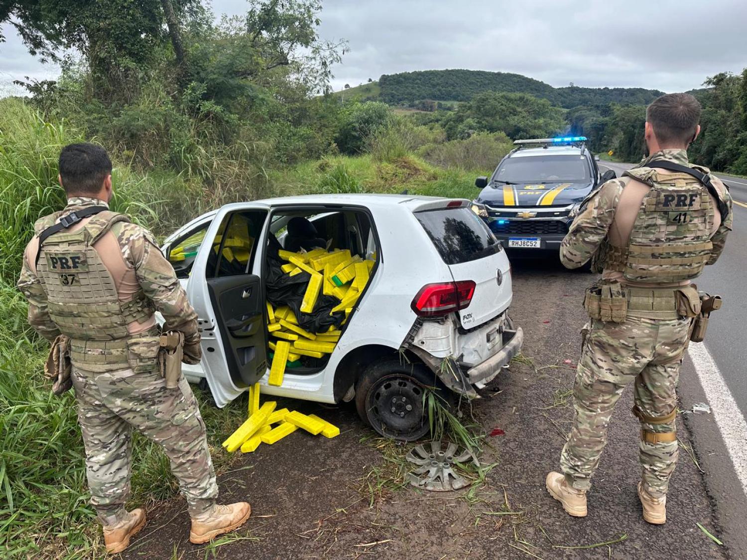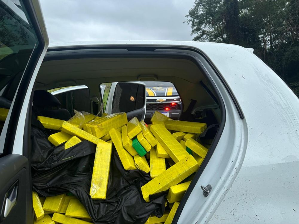 Pouco mais de meia tonelada de maconha foi apreendida numa ação da Polícia Rodoviária Federal (PRF) na BR-277, em Laranjeiras do Sul, na manhã deste domingo (14). A droga era transportava em um Fox com registro de furto que portava placas clonadas de um carro emplacado em Campina Grande do Sul, na região metropolitana de Curitiba.