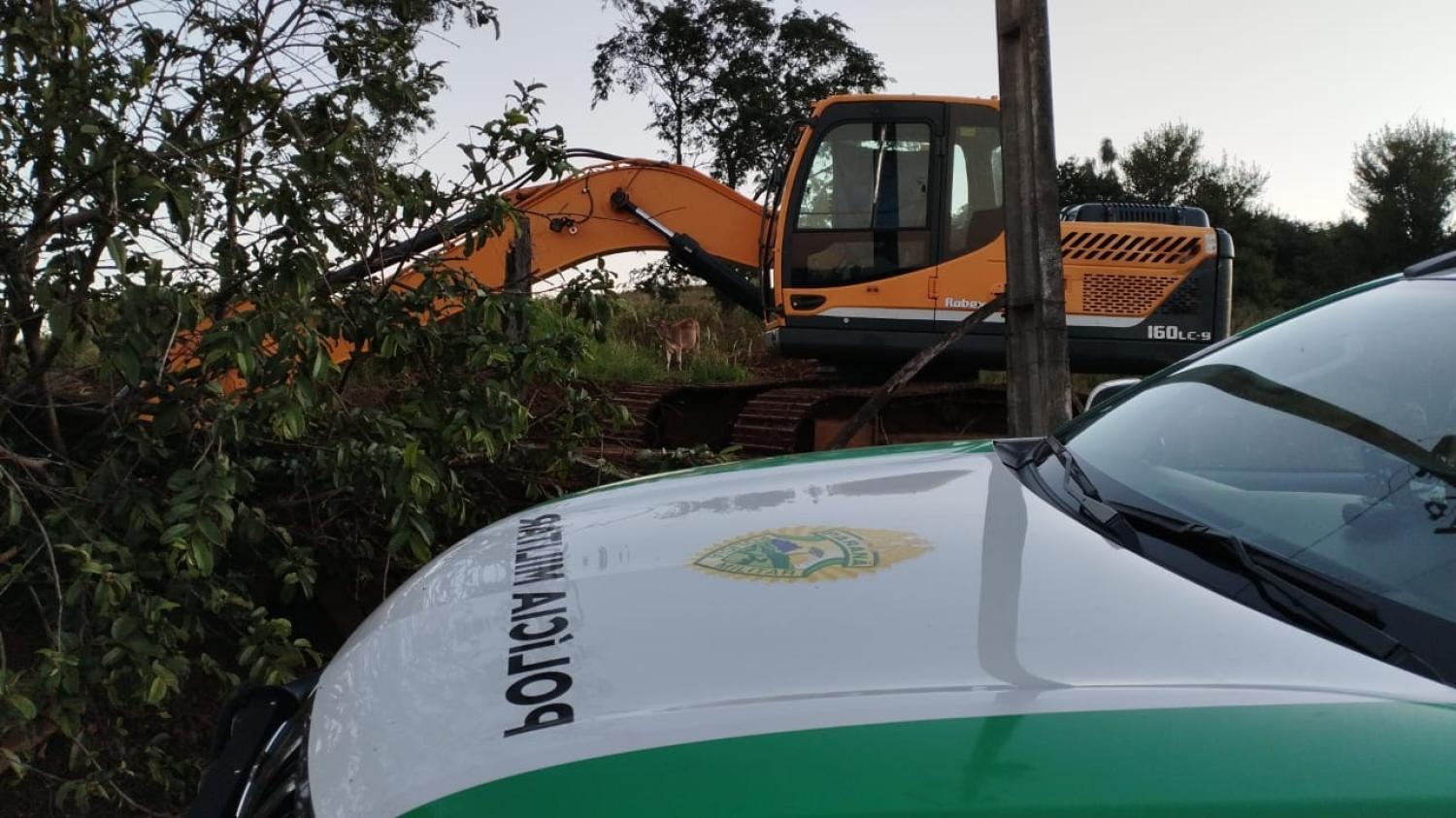 No local já estava uma equipe da Polícia Civil acompanhada do proprietário da área e do operador de uma retroescavadeira. A máquina foi apreendida pela Polícia Civil, que dará prosseguimento com as ações na esfera criminal.