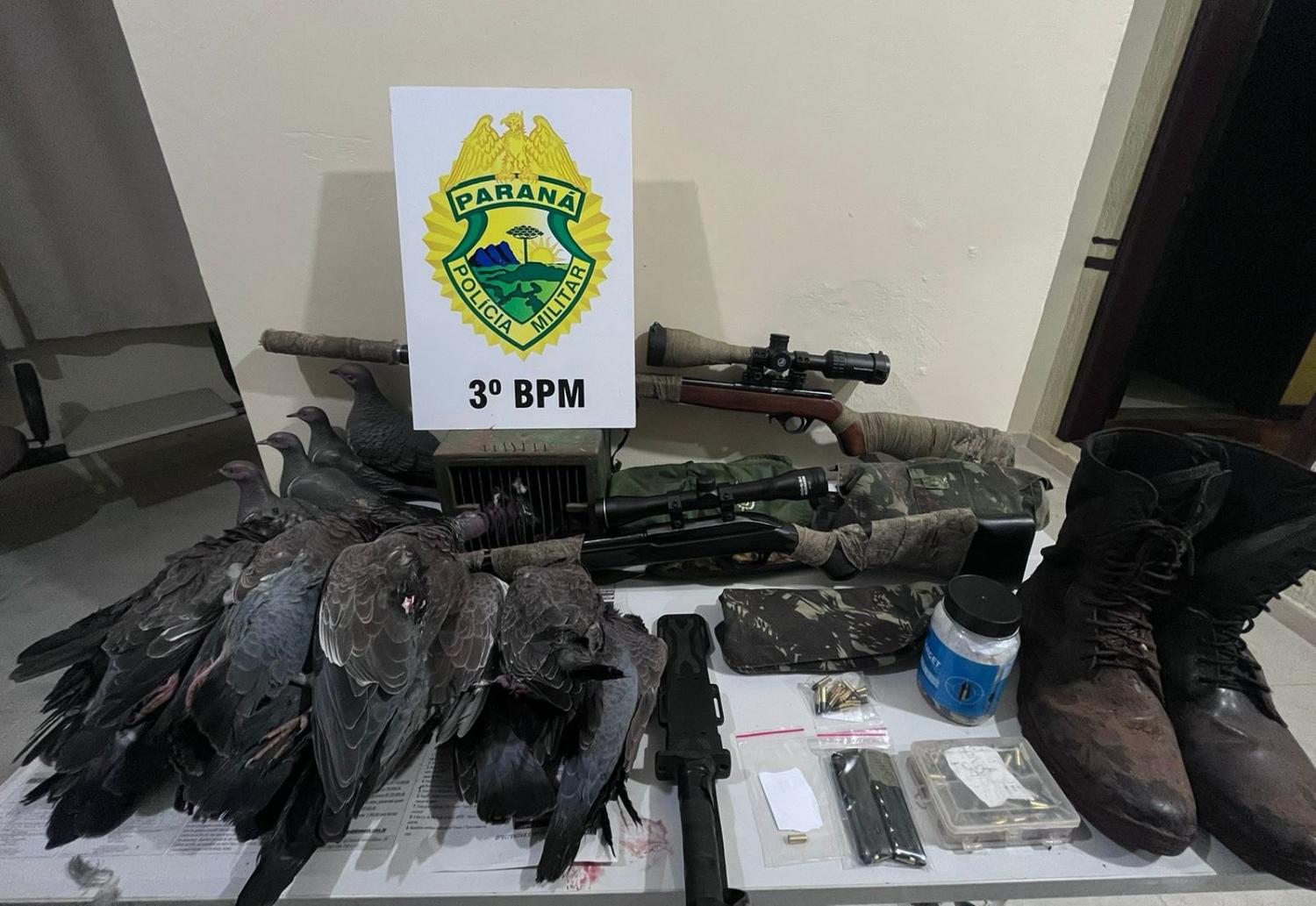 A polícia chegou até o suspeito, numa propriedade rural na Linha União, após denúncia de disparos de arma de fogo. Na abordagem constatou que o denunciado estava com duas armas de fogo (rifles calibre 22), luneta, silenciador, 213 munições calibre 22, uma faca, além de serem encontradas 16 pombas abatidas.