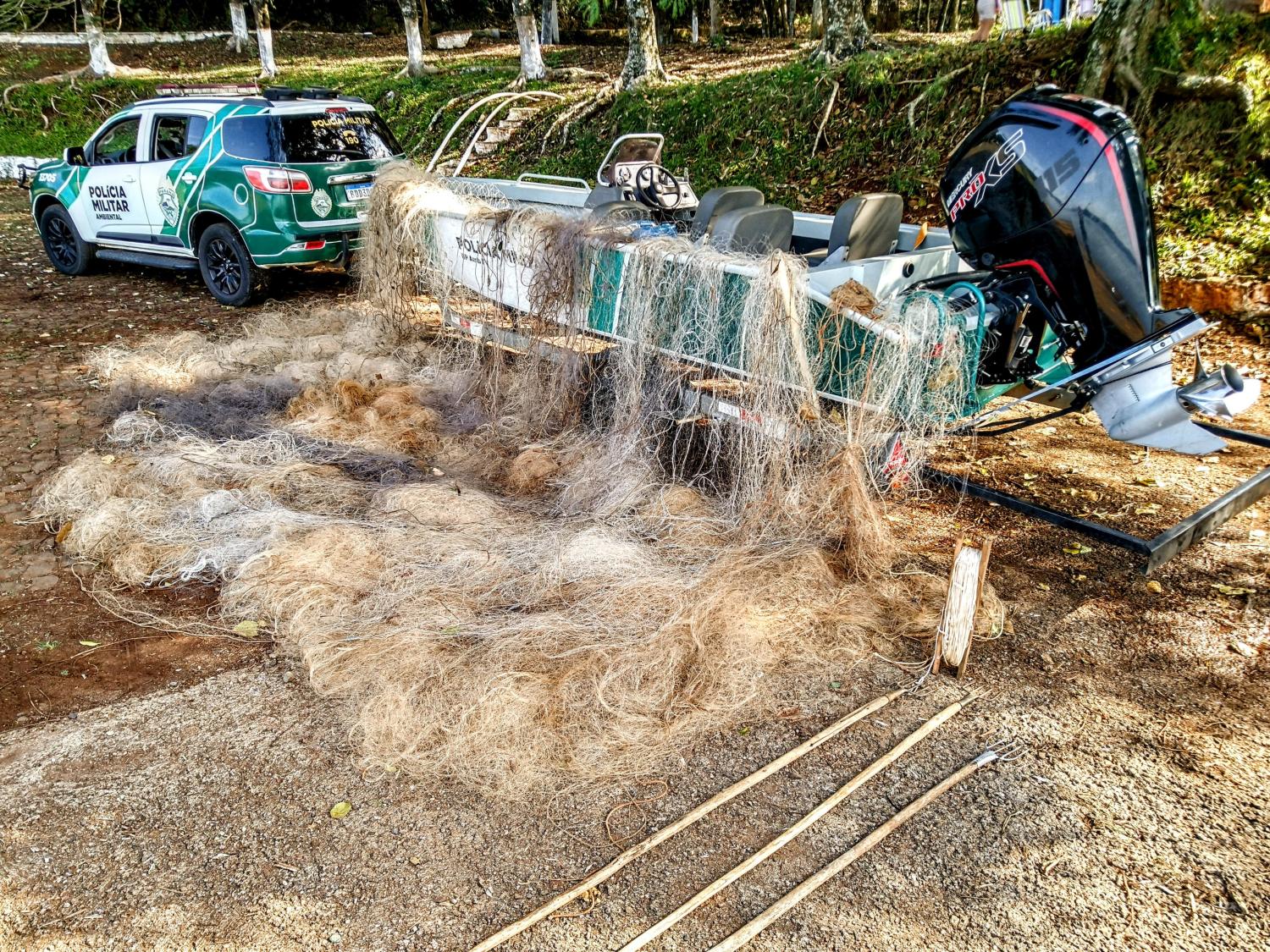 Na segunda situação, em patrulhamento aquático pelo Rio Iguaçu nas imediações entre os municípios de Quedas do Iguaçu e São Jorge do Oeste, após vistorias em diversas embarcações atracadas sem seus respectivos responsáveis, acampamentos e trilhas de acesso ao rio foram localizados e apreendidos diversos apetrechos proibidos utilizados em pesca predatória, dos quais totalizaram 3.300 metros de rede, sendo estas de diversas malhas, 02 tarrafas, 380 metros de espinhél, 11 bóias loucas e 03 fisgas, sendo estes materiais encaminhados à Sede da 4° Cia de Polícia Ambiental no município de Guarapuava para posterior destruição.