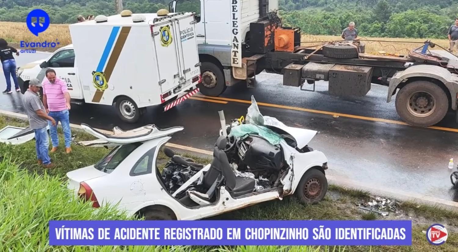 Foram identificadas as vítimas do grave acidente registrado por volta das 11:30 desta sexta feira, 18, na PR 158 próximo ao trevo de acesso para Saudade do Iguaçu em Chopinzinho, onde se envolveram um veículo de Corsa placas de Saudade do Iguaçu e um Caminhão bitrem placas de Bom Sucesso do Sul.