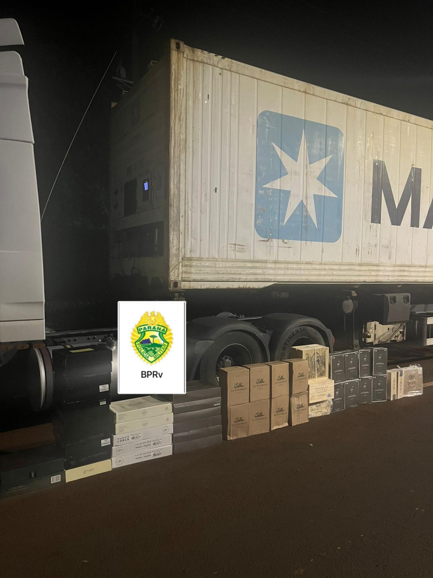 Durante vistoria no caminhão, foi localizado escondido em alguns compartimentos, diversas garrafas de vinho, totalizando 240 garrafas de vinho.