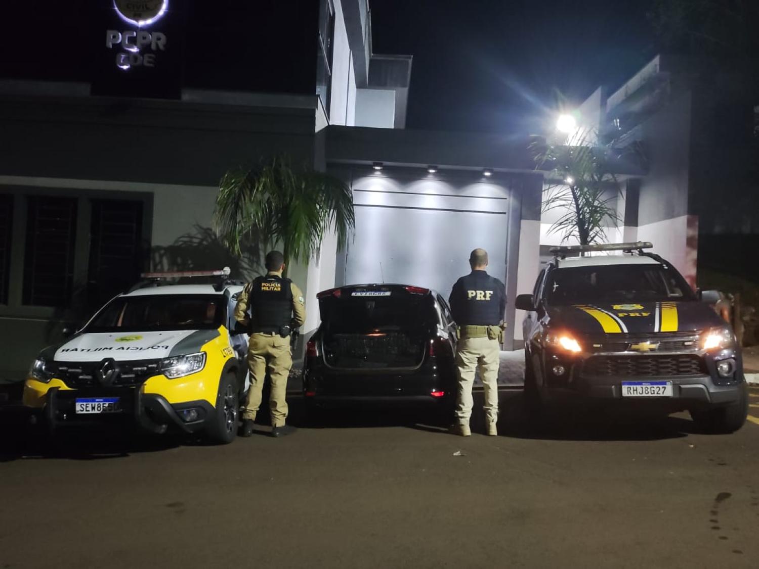 Após diligências da equipe e das equipes da Polícia Militar no trecho da BR 277 próximo a Laranjeiras do Sul, o veículo evadido foi localizado em um posto de combustível, já em Laranjeiras do Sul.
