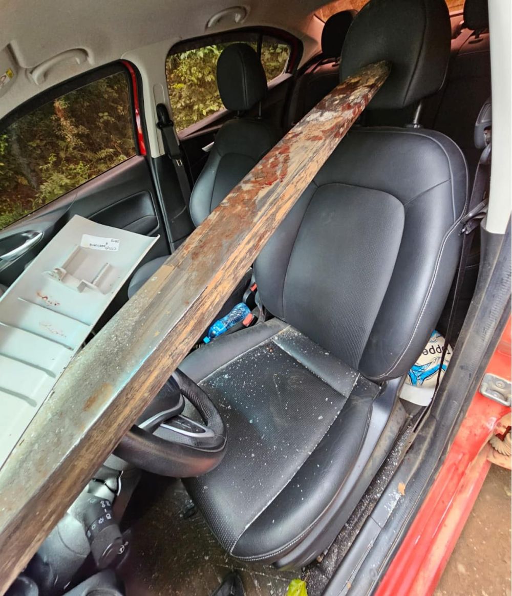 Na colisão uma das lanças do trator atingiu o veículo, exatamente no banco que a condutora estava.