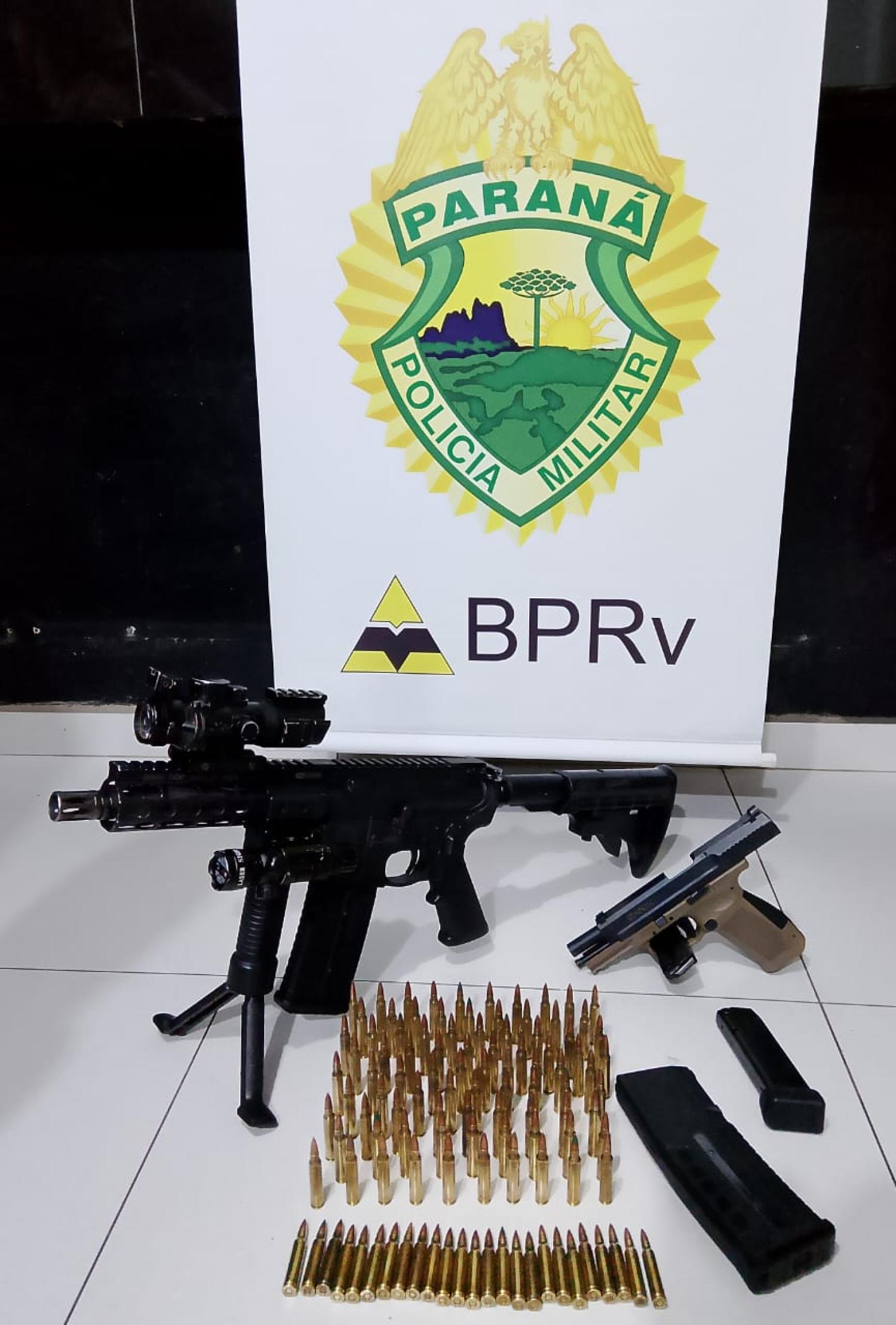 Em vistoria no veículo, foi localizado um Fuzil 5,56x45mm, acompanhado de luneta, mira laser e dois carregadores, uma pistola 9mm e 144 munições 5,56x45mm, não sendo informado sua origem ou seu destino, portanto, foi encaminhado à Central de Flagrantes.