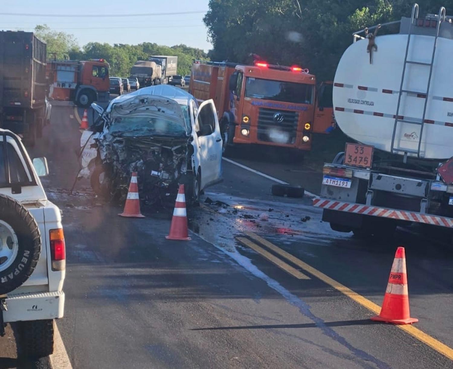 Um grave acidente de trânsito foi registrado na manhã desta quinta-feira (05) na BR-373, no município de Candói, região Centro-Sul do Paraná. A colisão envolveu um Fiat Ducato, com placas de Piraí do Sul, e um caminhão-tanque Mercedes-Benz, emplacado em Coronel Vivida.