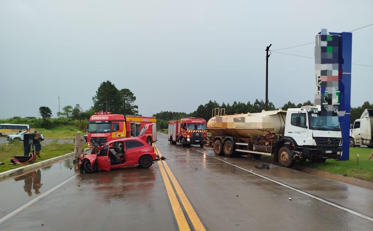 No local, constatou-se que o veículo GM/Celta colidiu lateralmente contra um primeiro caminhão e, na sequência, frontalmente contra um segundo caminhão. No automóvel encontravam-se duas vítimas, de acordo com informações, moradores da comunidade de Pinho Fleck, interior de Honório Serpa.